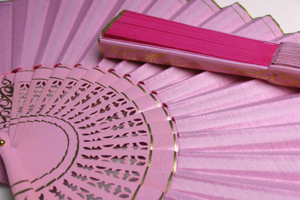 骨組み部分はピンクになり金色のペイントで手描き模様が施されています。骨組みの中央部分には透かし彫りが入っていてアバニコの先端部分には2枚の生地をしっかり固定する為に金色のテープによって仕上げられています。
