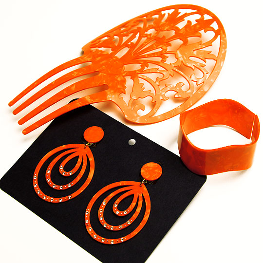 本体部分を高級感あふれるオレンジシェルで、更に耳飾りにはスワロフスキー製ラインストーンを散りばめたアクセサリーセットです。 ひと味違うとてもゴージャスな飾り物でドレスアップしてみませんか!