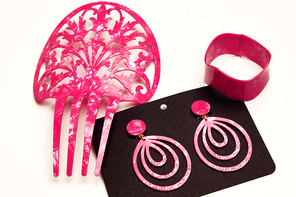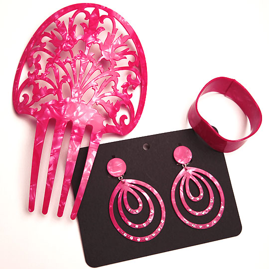 | 耳飾り(高さ7.5cm/幅5cm) | フーシア+スワロフスキー製ラインストーン |