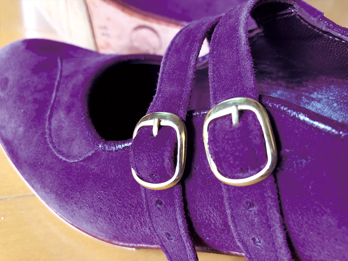 パープルのスエードで仕上げてあります。青系のパープルより、どちらかと言うと、野菜のナス系の色合いとなります。ご覧頂いてるPCや携帯画面の色調整によってトーンが実際の色合いと異なる場合がありますのでご了承ください。