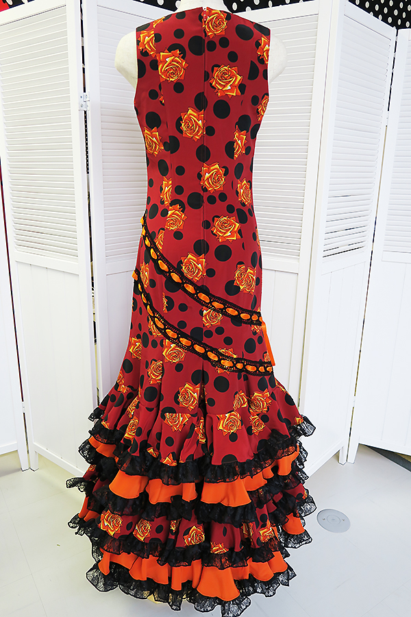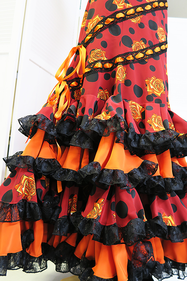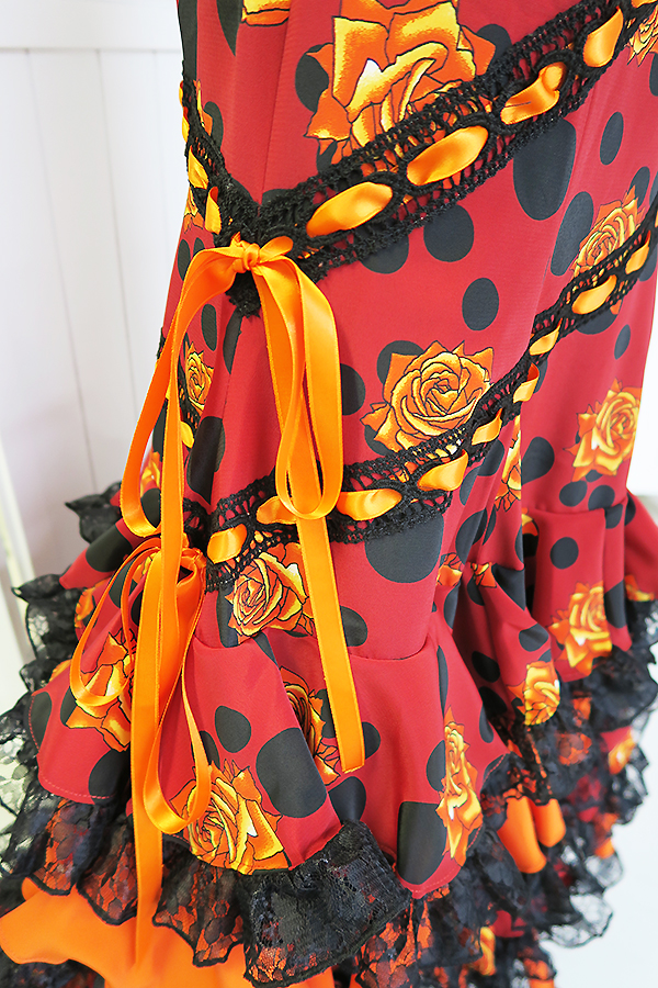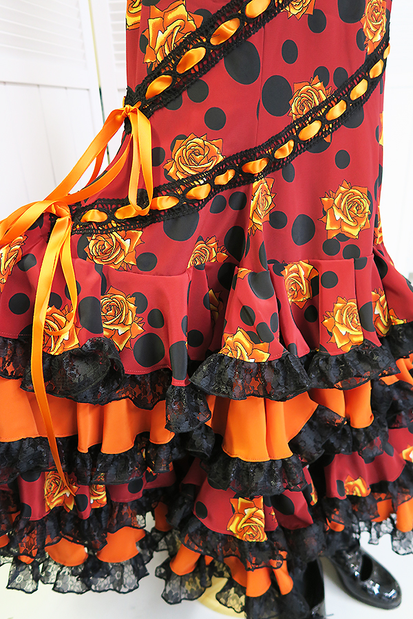 赤地にバラと黒の水玉等、とてもフラメンコチックな生地で仕上がりにはレース生地を各ボランテの先端にふんだんに取り付けた、とても豪華なワンピース衣裳となり、舞台では最高に栄える色合いのコーディネイトです。