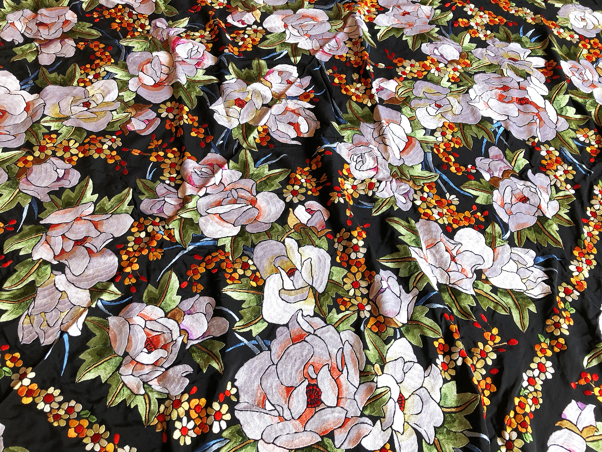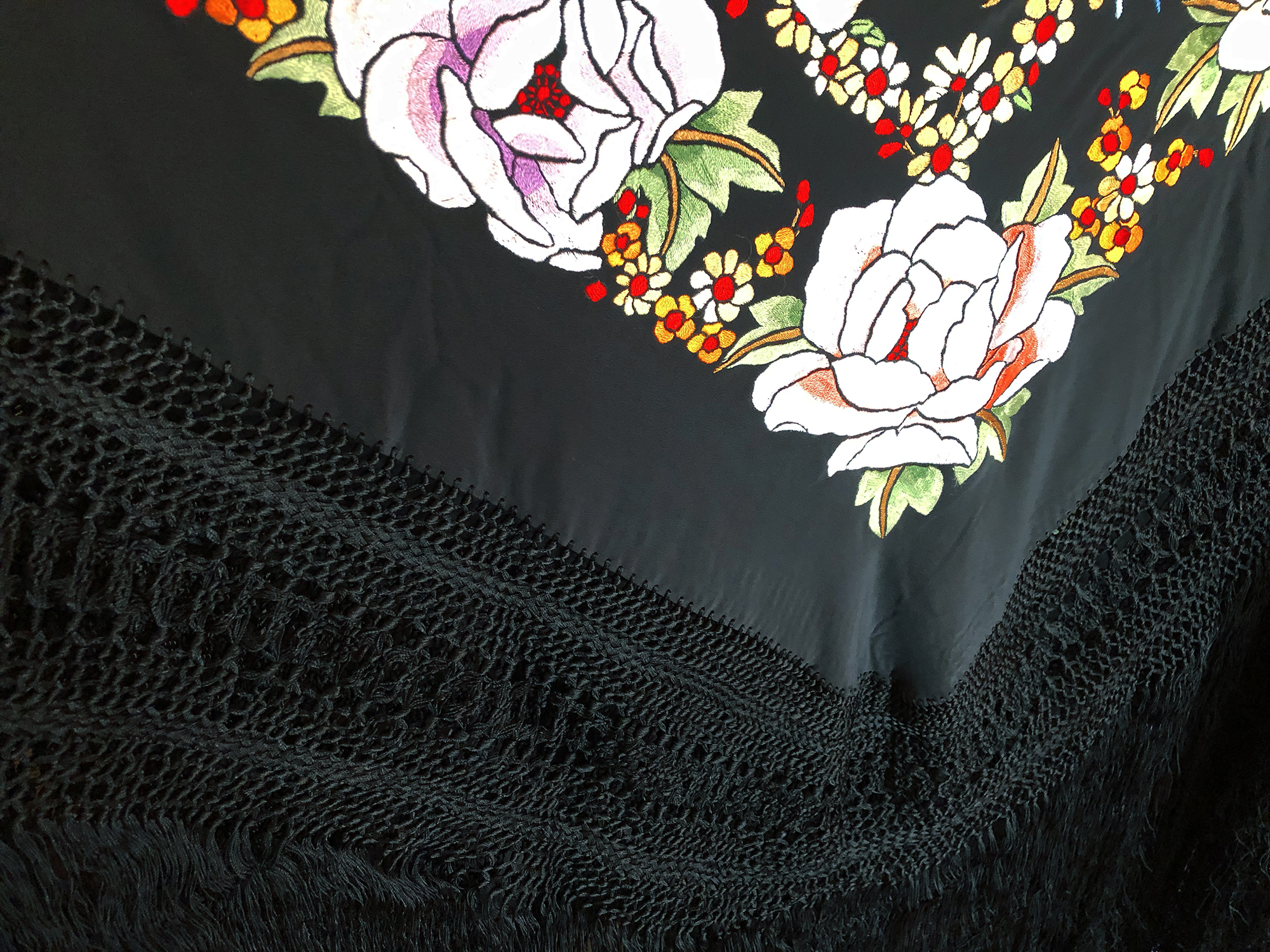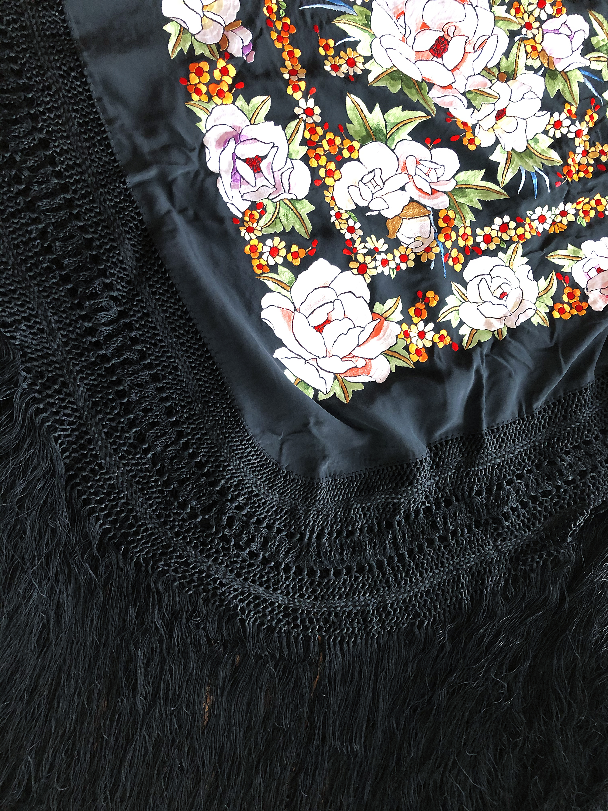 ✓このマントンは黒地に鮮やかなカラー刺繍のシルク製マントンです。140cmの大きさでフリンジフリンジも豪華でコレクションレベルの高級品です!