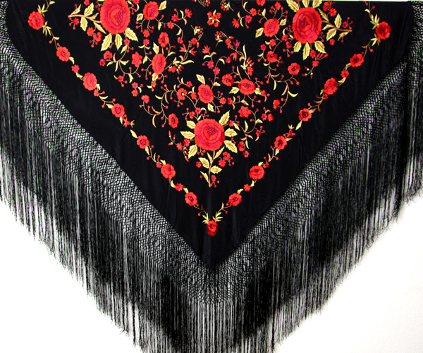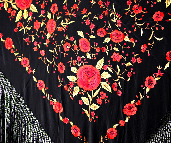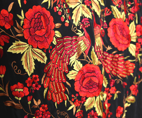 ✓このマントンは黒地に豪華に金と赤刺繍で仕上げてある鮮かな色合いとなっています。刺繍も反面は花の刺繍、もう反面は鳥の刺繍が入っている1枚で2度おいしいマントンに仕上がっています!フリンジの量等含め、とても取り扱い易い高級品です! 125cm/130cmの大きさの高級品です!