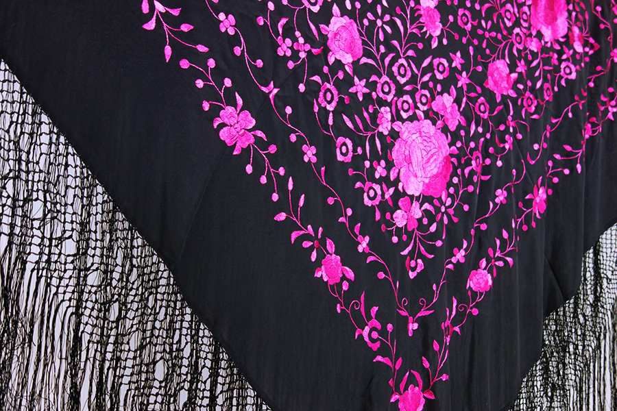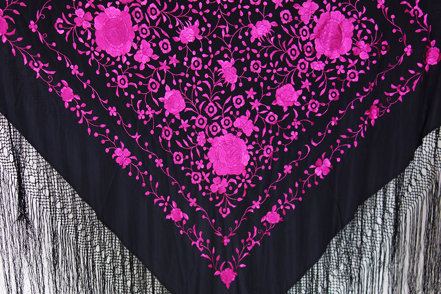 ✓このマントンは黒地に鮮やかなフーシアピンク刺繍のシルク製マントンです。135cmの大きさでフリンジが少ないので初心者にとても取り扱い易い高級品です! 130cm/135cmの大きさの高級品です!
