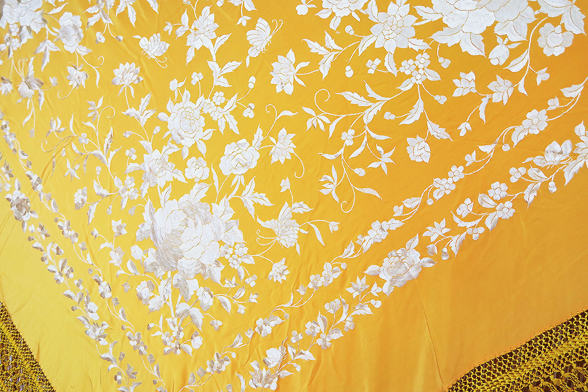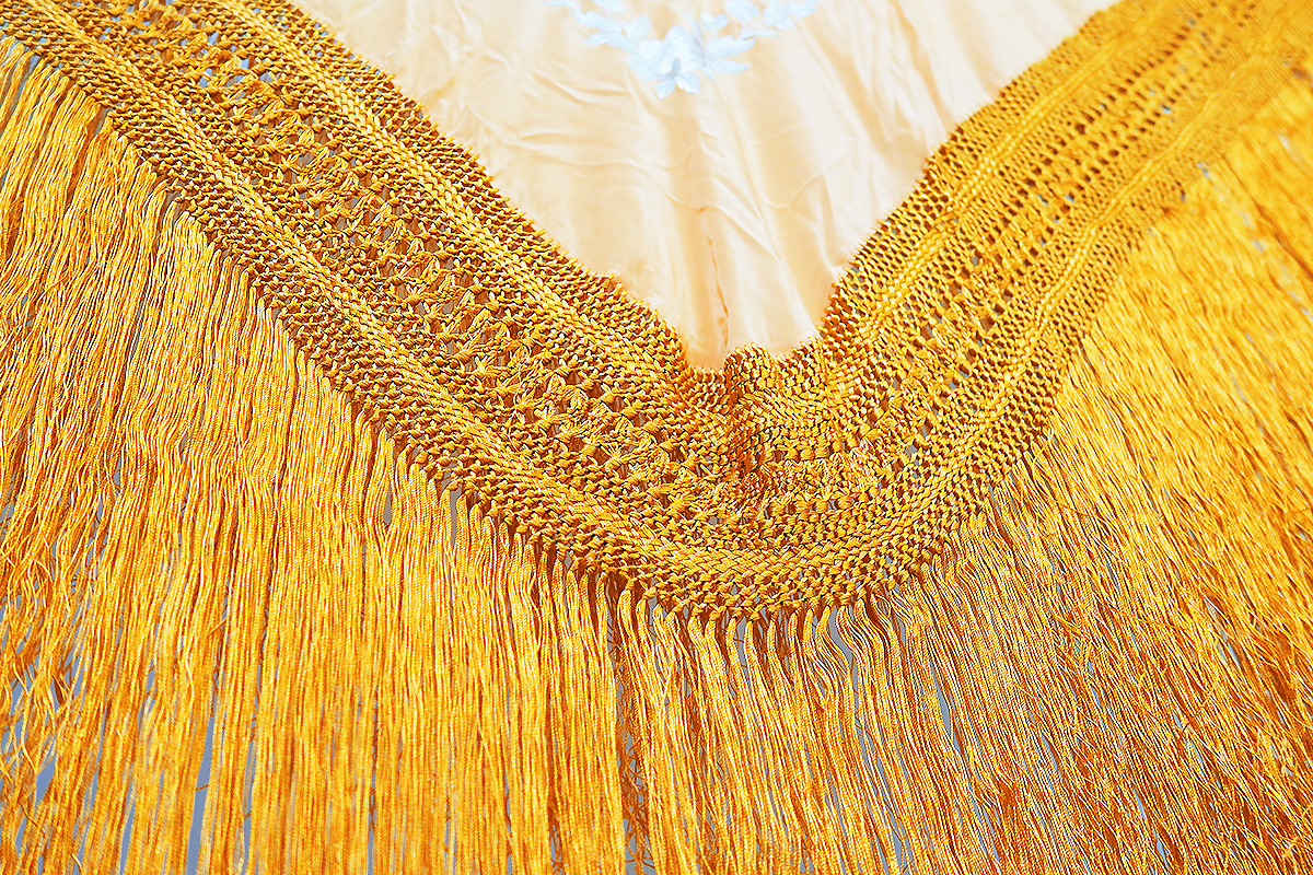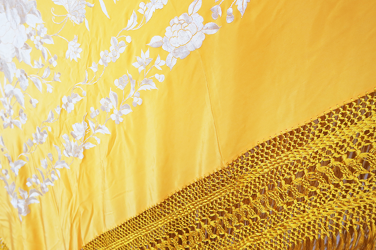 ✓このマントンはサンフラワー地に鮮やかなゴールド刺繍のシルク製マントンです。 130/135cmの大きさでフリンジフリンジも豪華でコレクションレベルの高級品です!