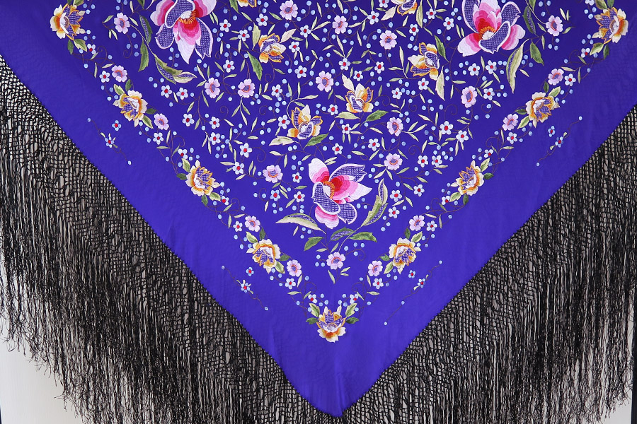 ✓このマントンは黒地にカラー刺繍、フリンジはゴールド色仕上げのゴージャスなシルク製マントンです。豪華な刺繍に編み込みの量がほどよい重さのとてもバランスよい130/135cmサイズの高級品です!