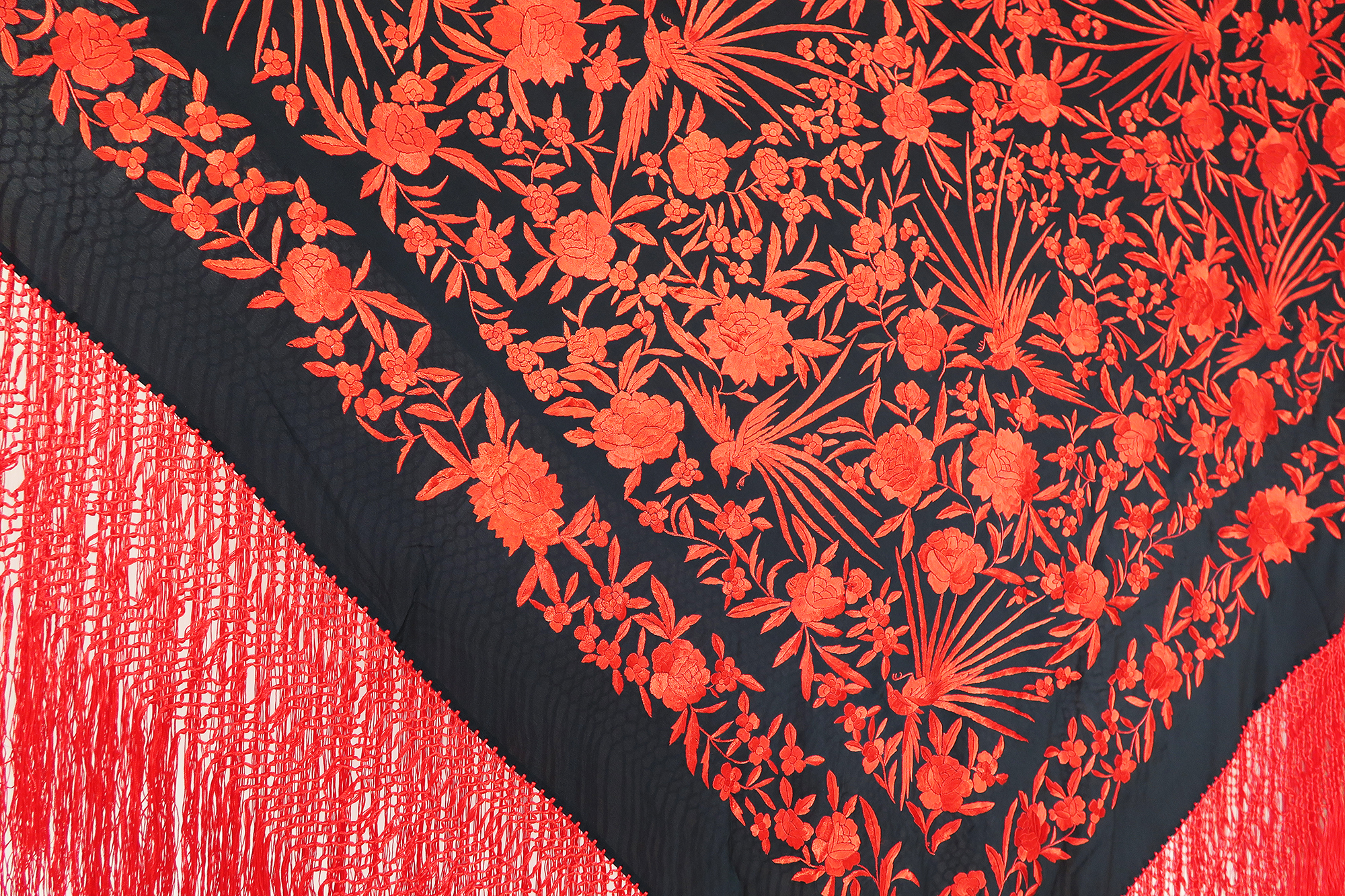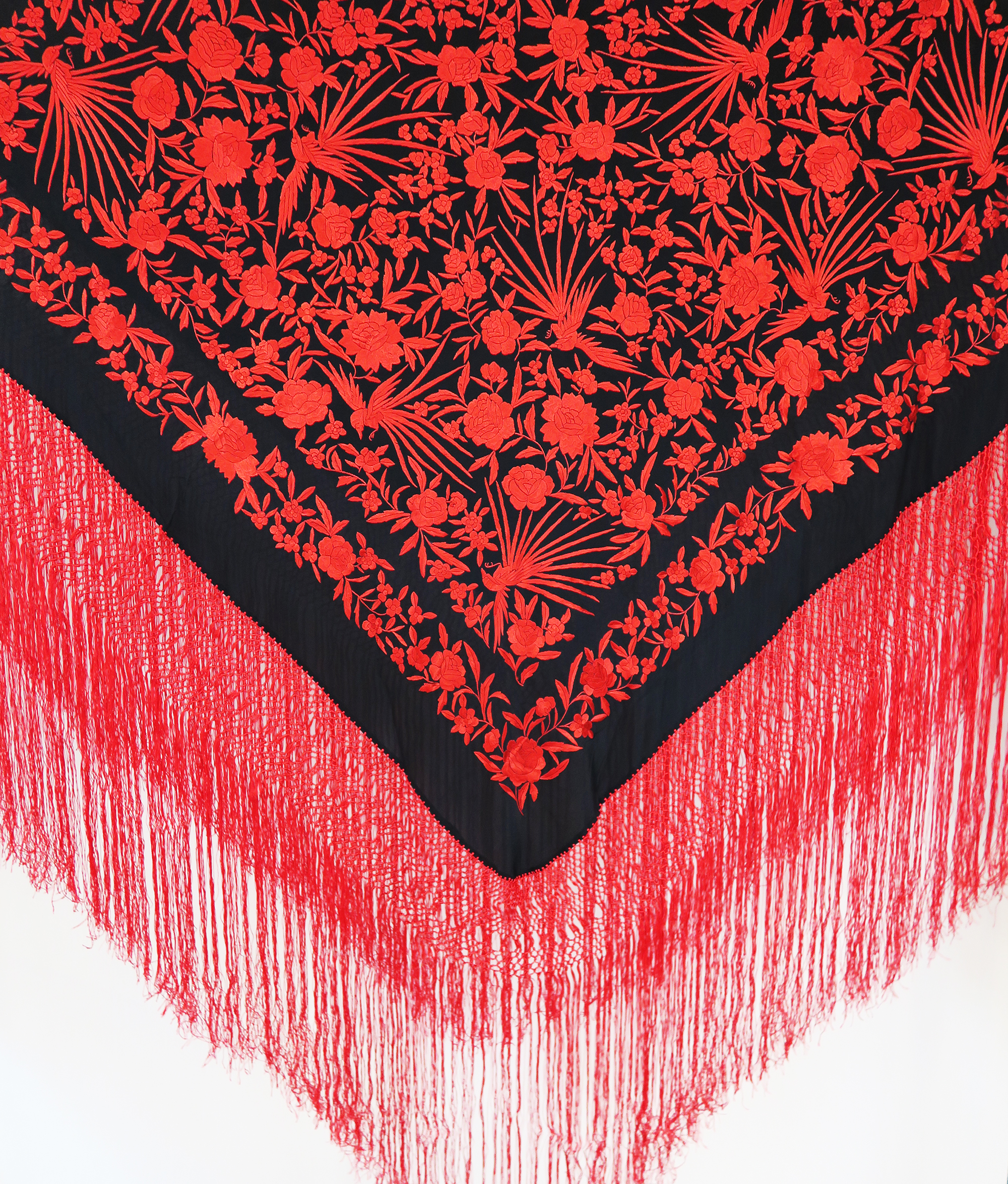 ✓このマントンは黒地に鮮やかな赤刺繍のシルク製マントンです。 135/140cmの大きさでフリンジも刺繍と同色の真っ赤が取り付けてある、とても豪華でコレクションレベルの高級品です!