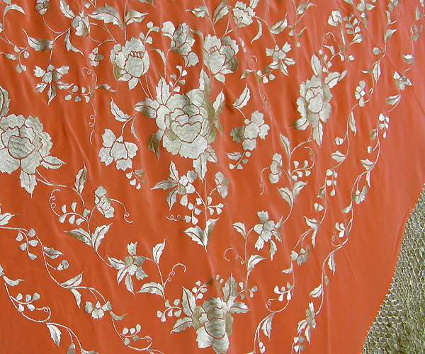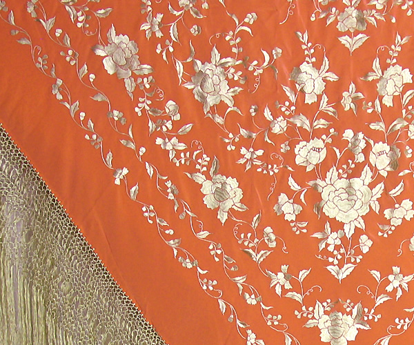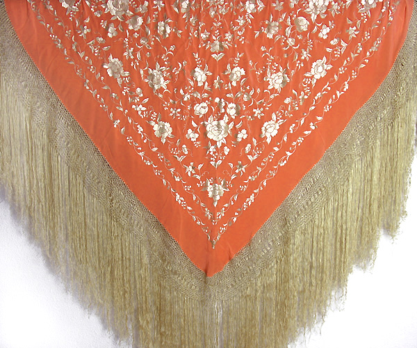 ✓このマントンは鮮やかなコラール地にベージュ刺繍、フリンジは刺繍と同色仕上げのシルク製マントンです。豪華な刺繍に編み込みの量がほどよい重さのとてもバランスよい135/140cmサイズの高級品です!