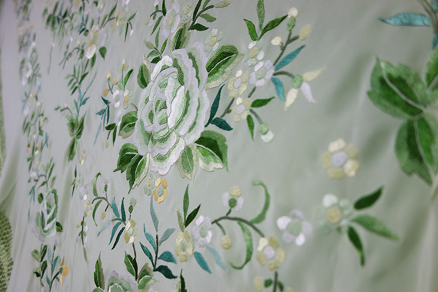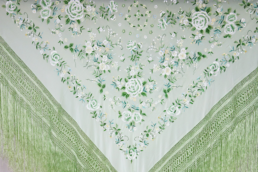 ✓このマントンはとても上品なライムグリーンx白・グリーン系刺繍のシルク製マントンです。 フリンジ等も高級仕上げで重量感があり最高のマントンに仕上がっております。 大変珍しい色合いでサイズもバランスよい135/140cmの高級品です!