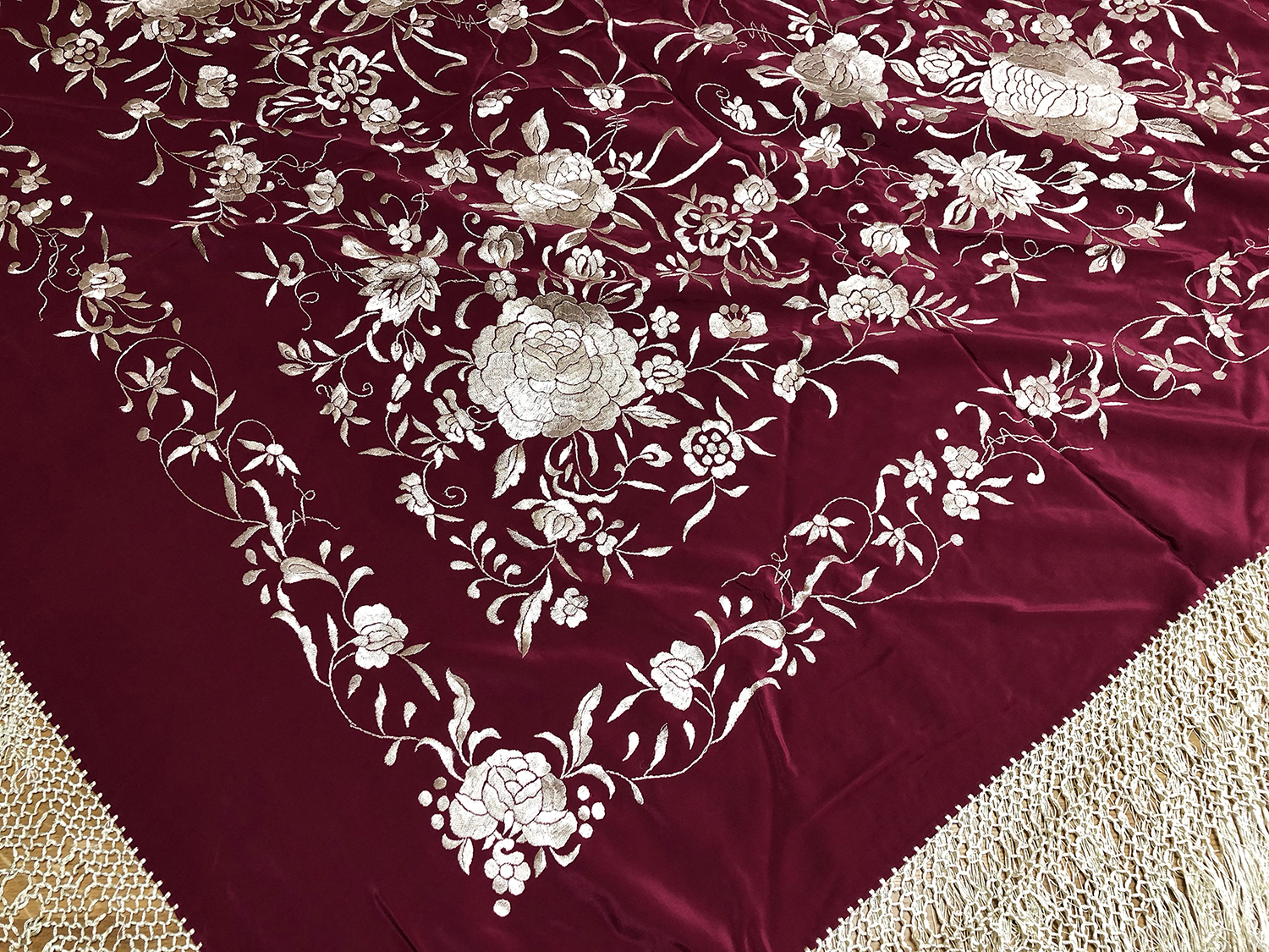 ✓このマントンは落ち着いたボルドー地にベージュ刺繍、フリンジは刺繍と同色仕上げのシルク製マントンです。豪華な刺繍に編み込みの量がほどよい重さのとてもバランスよい130/135cmサイズの高級品です!