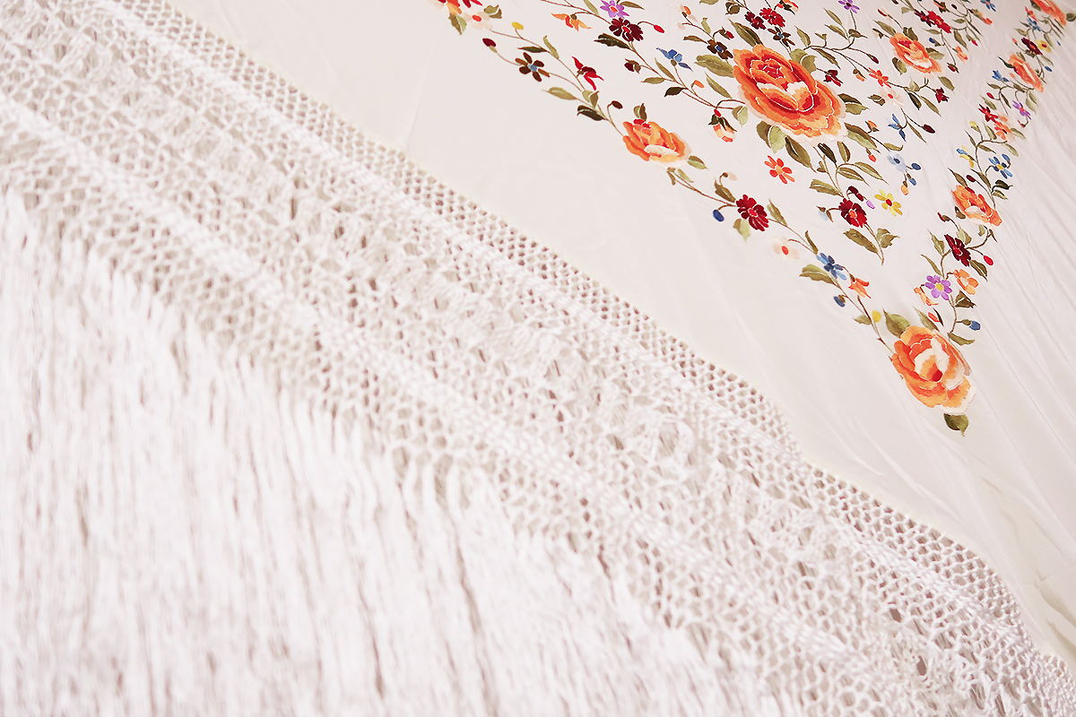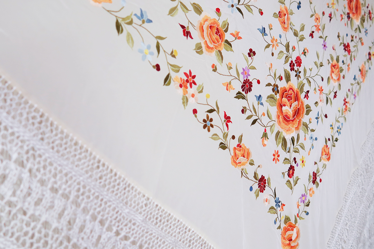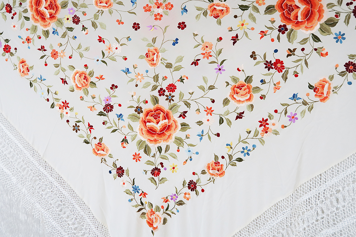 ✓高価なフリンジを取り付けてある高級マントンです! このマントンはとても鮮やかな象牙ホワイト地にカラー刺繍仕上げのシルク製マントンです。豪華な刺繍に最高級のフリンジ、そして編み込みの量がほどよい重さのとてもバランスよい130/135cmの大きさの高級品です!