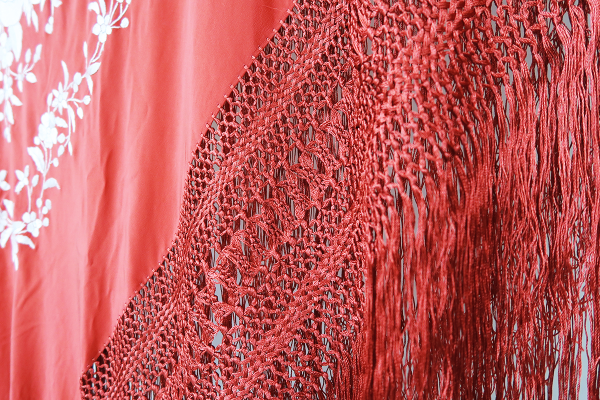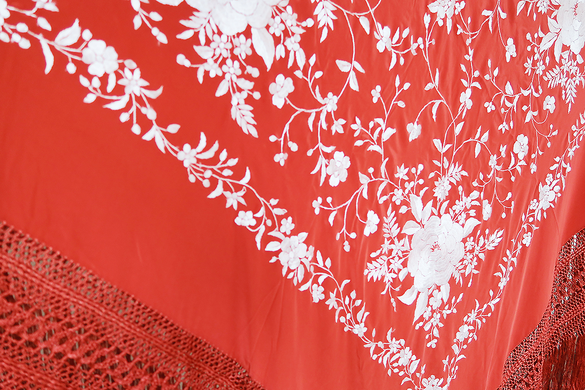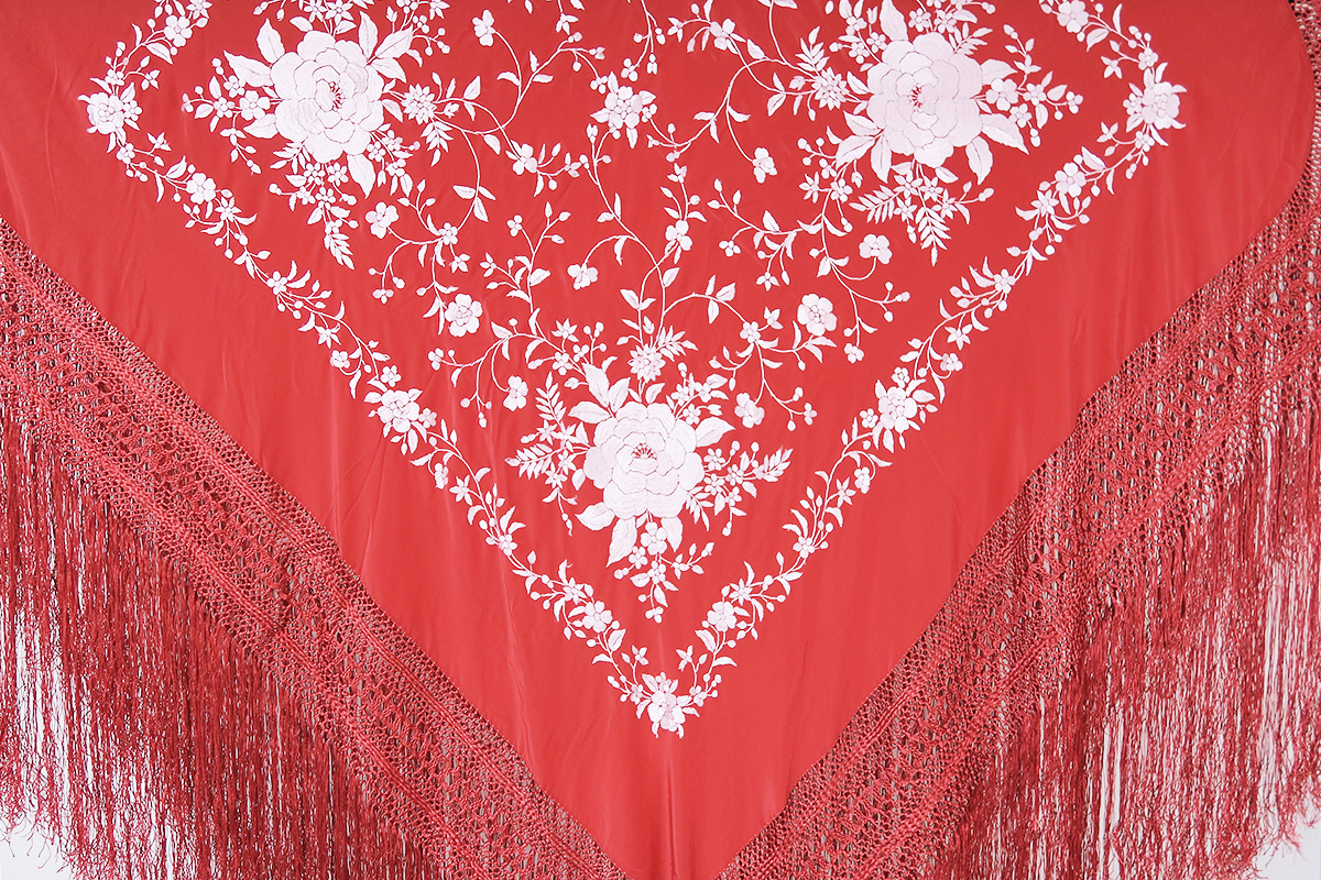 ✓このマントンはとても鮮やかなコーラル地にシルバー刺繍仕上げのシルク製マントンです。豪華な刺繍に編み込みの量がほどよい重さのとてもバランスよい130/135cmの大きさの高級品です!