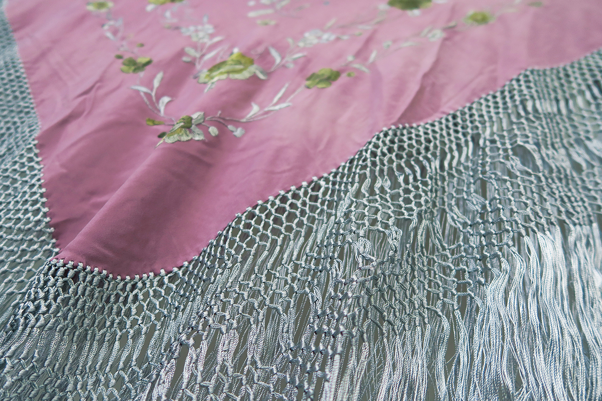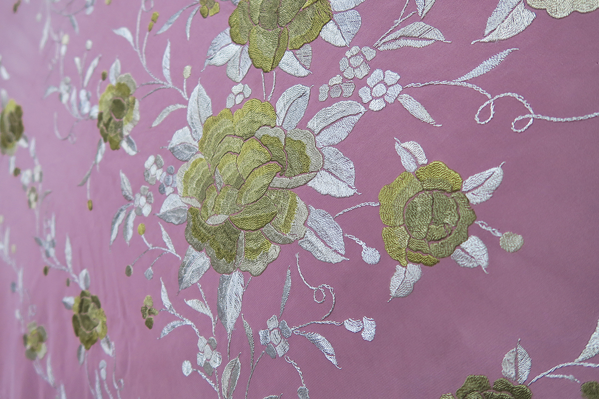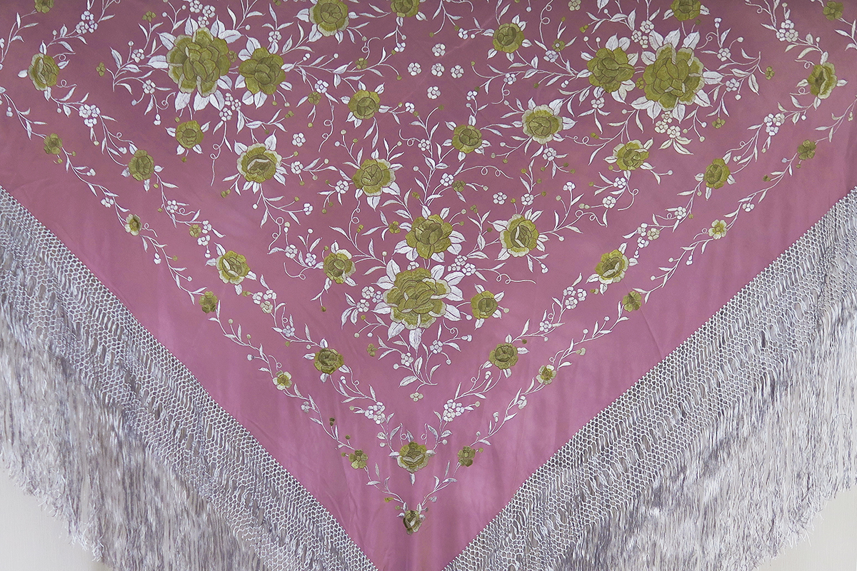 ✓まず誰ともカブル事ない色のマントンではないでしょうか!! このマントンは紫(フジ色)系xゴールトとシルバー系刺繍にシルバーのフリンジで仕上げてある、めったにお目にかかれない色合いで仕上げてある 130cm/135cmの大きさのマントンです!